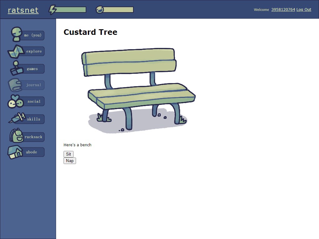 At the custard tree in the middle of town, you may either nap or sleep on the bench. Neither actions do much.