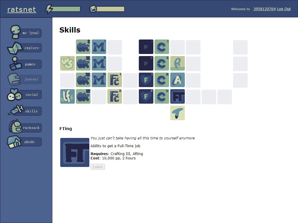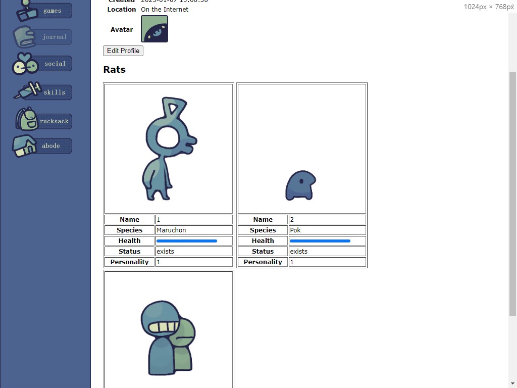 The first menu item takes you to your profile page, where you can set your location, catchphrase, and look at your pet rats' statuses.